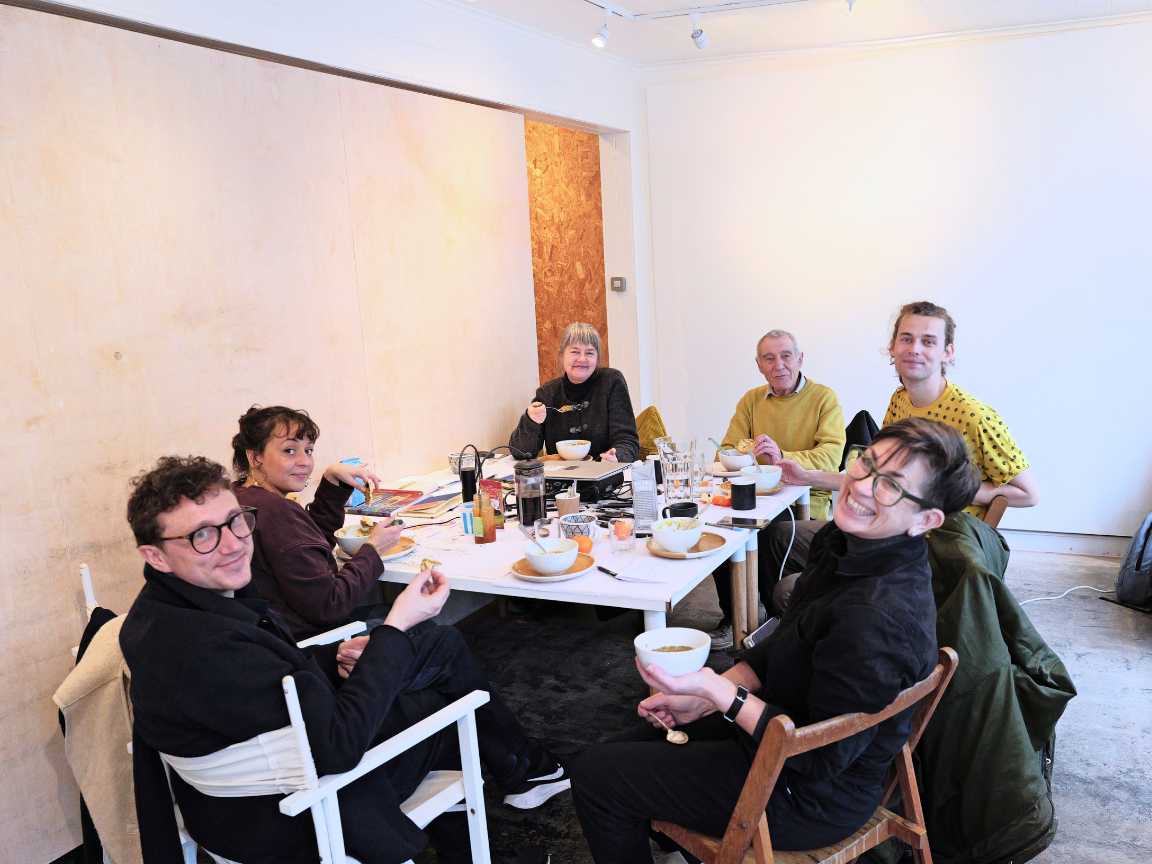 Lunch with Bryony Graham, Director of Hamilton MAS, with Ruth Catlow, Simon Read, Stan Willey, Josh Hall and Lora Aziz.